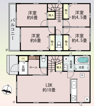 - 全居室収納あり、LDK18帖、リビング階段、主寝室6帖が2部屋