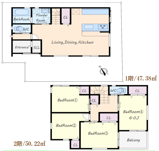 - 4LDK、LDK19帖、SIC付き、広々キッチン、南向きバルコニー、ワイドバルコニー