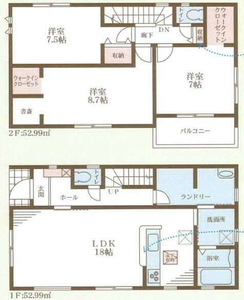 - LDK18帖以上、全居室収納あり、WIC付き、家事のしやすい間取り