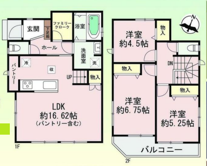 リビング階段・カウンターキッチン・システムキッチン・パントリー・浴室乾燥機・温水洗浄便座・ファミリークローク・全居室収納・閑静な住宅街・角地